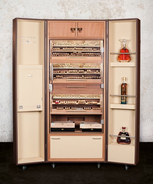 La marque propose une armoire à cigares unique sous forme de malle, qui permet d’abriter et de conserver près de 1.400 Havanes. La malle est munie d’un système d’humidification et de ventilateurs pour réguler l’air afin de conserver au mieux les précieux cigares et s’ouvre d’une simple pression sur la télécommande pour vérifier l’état de la collection.